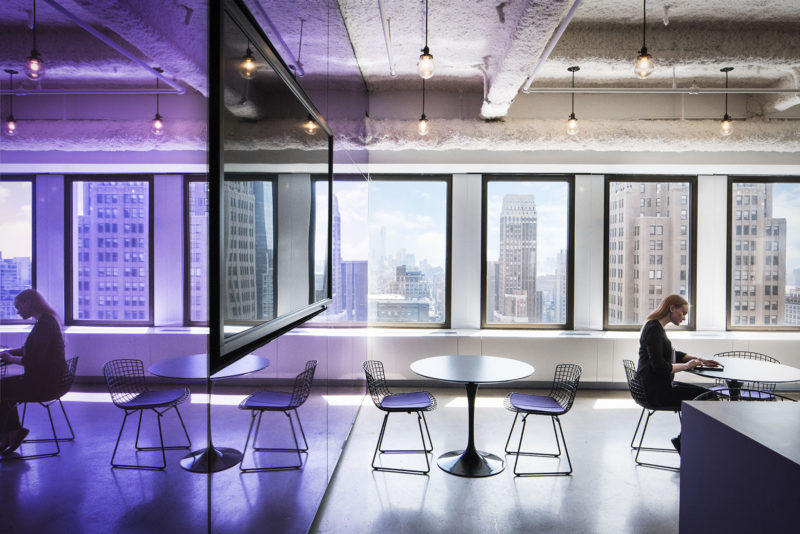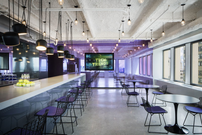 Bright pops of color energize the workplace with back-painted laminated glass in blue and purple. Great Room cafés on both floors are intentionally distinct from the workspaces, providing staff with a refreshing change of environment. With dramatic views, sophisticated lighting, café tables, and a riveting reflective purple glass end-wall, it is space for recharging, eating, and casual connection with colleagues.,” says Elkus Manfredo Architects.
