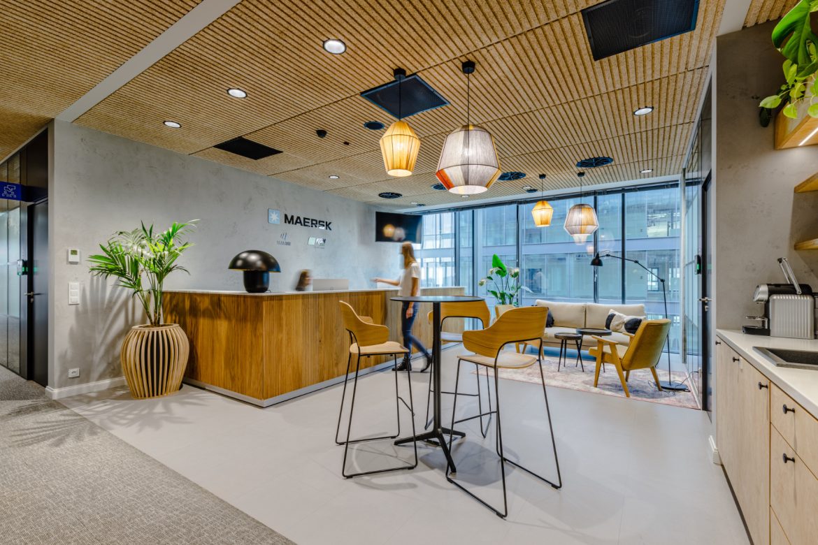 When designing the interior for Maersk, we tried to make maximum use of natural “living” wood, which builds an atmosphere of homely warmth and a certain material nobility that gives timeless beauty. We used it primarily in elements that users always have in sight and often touch: in the fronts of cabinets and customized furniture, shelves, chair design and wall cladding. We have also introduced finishing materials that are not wood, but which allow us to reinforce the feeling of being surrounded by natural, warm surfaces (natural cork, wood wool ceilings, mdf panels with visible “chip”, upholstery in sand and beige tones, jute and rattan details in pots and lamps).”