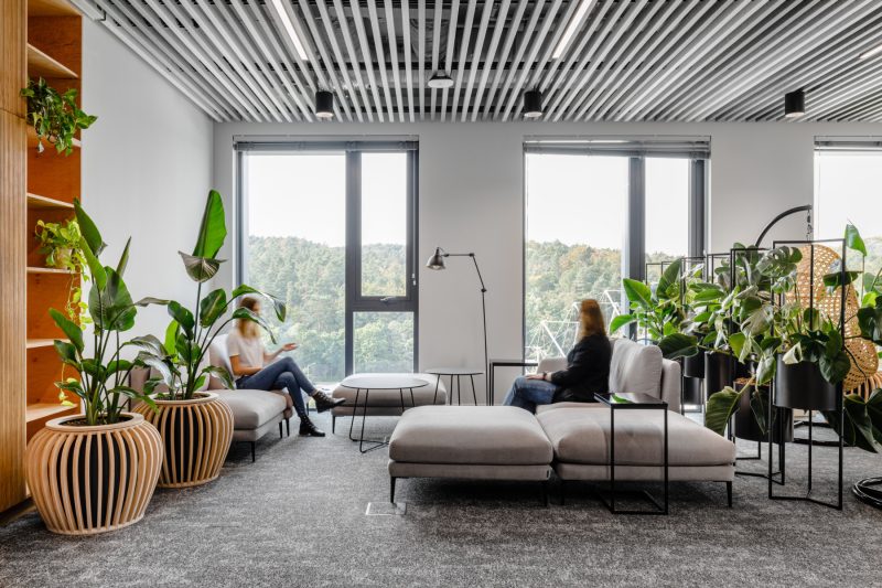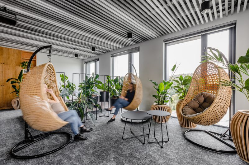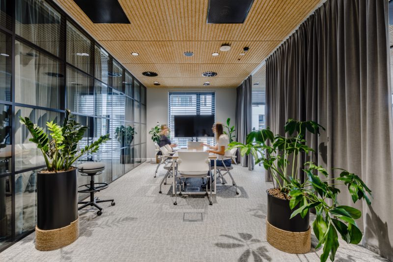 “Instead of a typical open space, we proposed smaller work zones, separated by various elements such as acoustic panels, green screens, free-standing greenery, and acoustic curtains. They give employees the feeling that they are in “their” space, also increase acoustic and visual comfort, the ability to better focus on daily tasks.