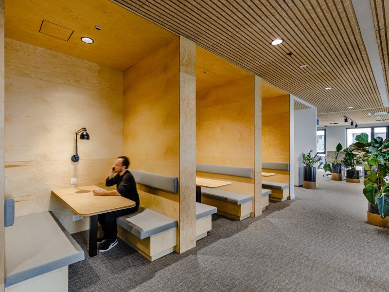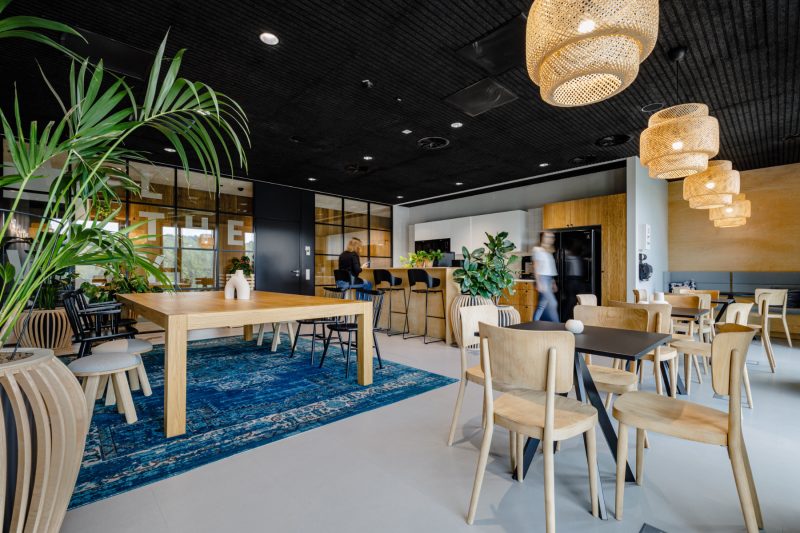 We enriched the work space with variously equipped support zones, enabling tasks of a different nature than individual work at a desk: networking, creative work zones, focus rooms, phone booths, work niches. In addition to the traditional table with comfortable chairs, some of them are also equipped with soft furniture such as sofas, home armchairs, but also with tables “on high” and with adjustable top height. Employees can hold a quick meeting, brainstorm, do video-call, or just work one-on-one in other ways in such places. And when it’s time for a break, they have a sizable kitchen at their disposal, where they can sit down for lunch and conversation together at a large common table, or “hole up” with 2-3 people at intimate tables set up by the façade, looking out over a beautiful green hill.