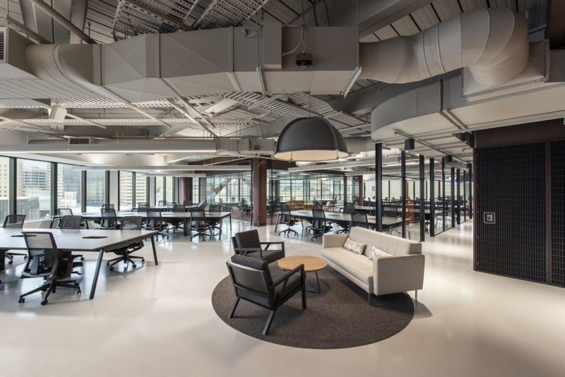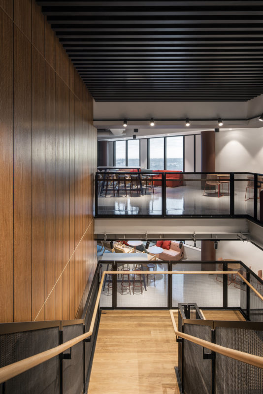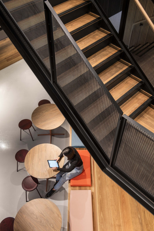 Building an edgy and industrial experience drove an outcome that celebrated the existing base building elements. Exposed floor and ceiling slabs were simply painted to express the bare bones, while reducing materials and focusing on longevity were the main sustainability targets. The introduction of the interconnecting stair and exposed services were a critical and complex piece of the puzzle, requiring a close and communicative design team to coordinate structure with services and architectural elements – catering to the functional design brief, as well as future proofing for potential growth in connecting to other levels in the future,” says Studio Nine Architects.