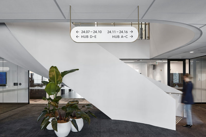 The design’s driving concept is underpinned by themes of fluidity, growth and solid foundations. These interconnected ideas are expressed as strong spatial and architectural elements, beginning at the entry, with a generous reception area that welcomes visitors. Beyond its organically shaped desk is the sculptural stair, which connects all four levels. This dramatic structure visually anchors the fit-out, while around it, different settings allow employees to choose how they want to work by offering zones for collaboration alongside intimate areas for quiet retreat.