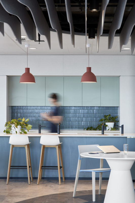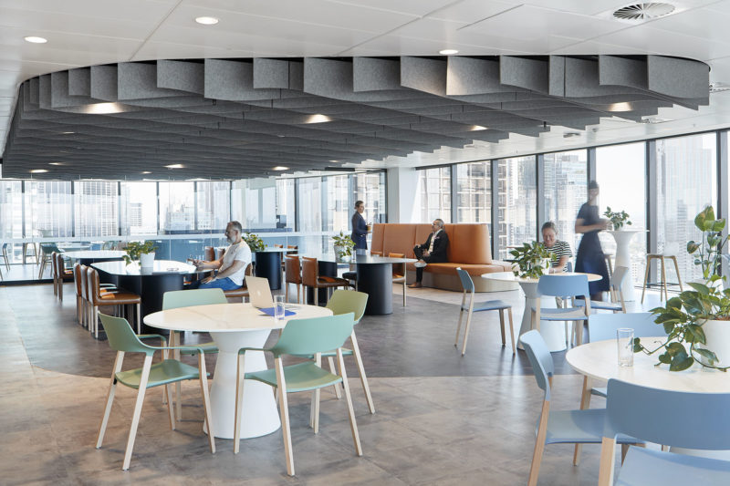 Key to the overall design is the Green House, an informal meeting space that allows employees to gather in small to medium groups. While a variety of modern furniture in pastel blue, pistachio green and warm ochre characterises this area, it’s defined by a striking ceiling feature that recalls rippling water. This is adjacent to the Wintergarden, which boasts a double-height space and abundant plantings. Panoramic views of the north of the city further extend the connection to nature, as does the natural stone flooring, timber detailing and subtle textures of the fabric upholstery.