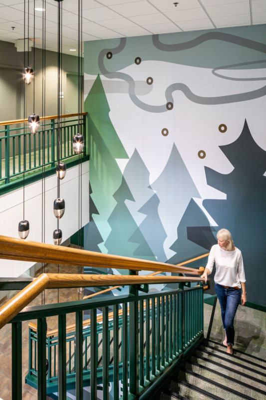 The design team redesigned the lobby experience to make sure that the first impression in the new space would be a friendly face, a clear brand impression and a large monumental stair. The stair was existing, but the design team redesigned the walls, lighting, colors and materials of the stair to give it a new look. It is now a feature and is the center of the story telling graphics for the space.