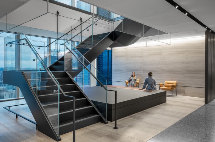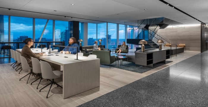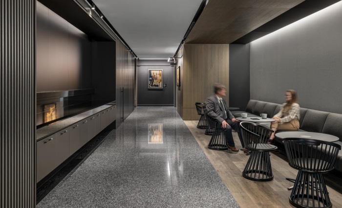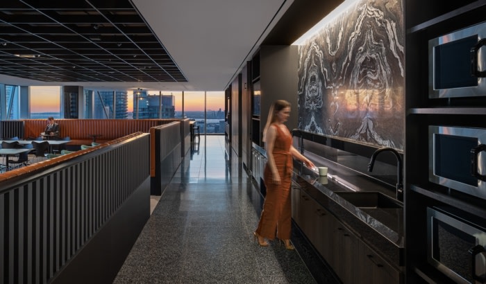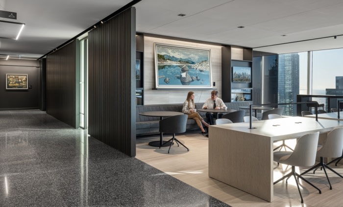 The atmosphere evolves into a moodier hospitality inspired environment on the 40th floor, where shared meeting spaces and a large social cafe provides ample space to gather and socialize. Smooth curves introduced in the furniture, light fixtures and accent tables juxtapose the sharp angles of the tile and stone helping to soften the space and create a comfortable environment.