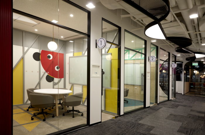 Firstly, is to blend the new agoda branding image, agoji, to the working space. White and black is the basic color for overall office space then we splash 5 colors of agoda logo mark as the accent of decoration, to make office more lively and fresh. You can see 5 colors in form of wall painting, floor finishing and upholstery fabric.