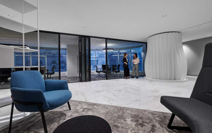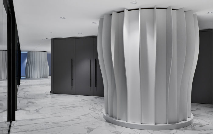 Working closely with the client to meet the unique needs of diverse groups, their new workplace boasts a variety of sophisticated executive boardrooms, increased client-facing areas, social spaces that can expand for town hall meetings, and an innovation hub. Air Canada’s very specific brand guidelines were met, with themes of flight referenced throughout, including structural columns crafted into art to resemble the propeller engines of jetliners.
