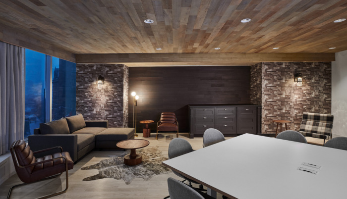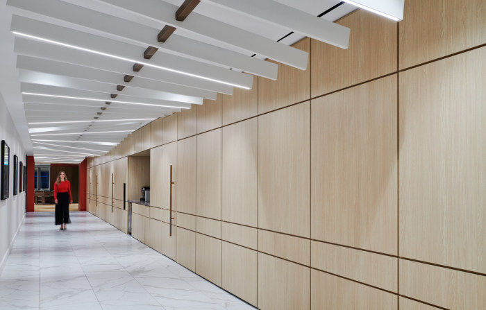 From reception through the wide corridors, the undulating lighting fixtures create a sense of wind and motion, as staff and guests travel to the boardrooms and lunchroom. The multi-purpose innovation hub named “The Cabin” featuring wood ceilings and stone walls is an ideal cove for inspiration and creativity. The use of white, red and light wood finishes reinforces the company’s deep Canadian roots in what has quickly become Air Canada’s most popular office in the city.