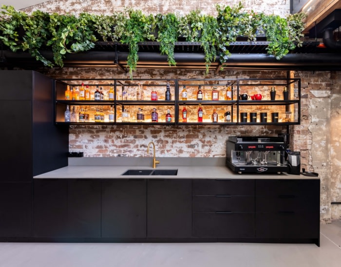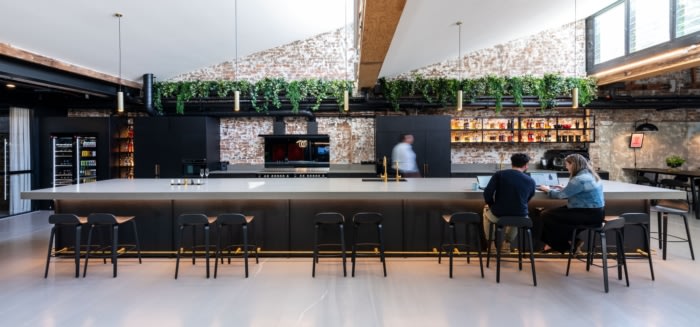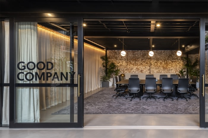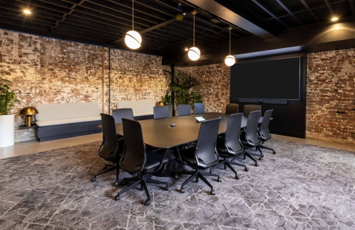 The ground floor was divided into two zones; the event space connecting to the boardroom and the ‘dark side’ under the mezzanine. The event space features an nine-metre-long island retrofitted to act as a touch-down point.