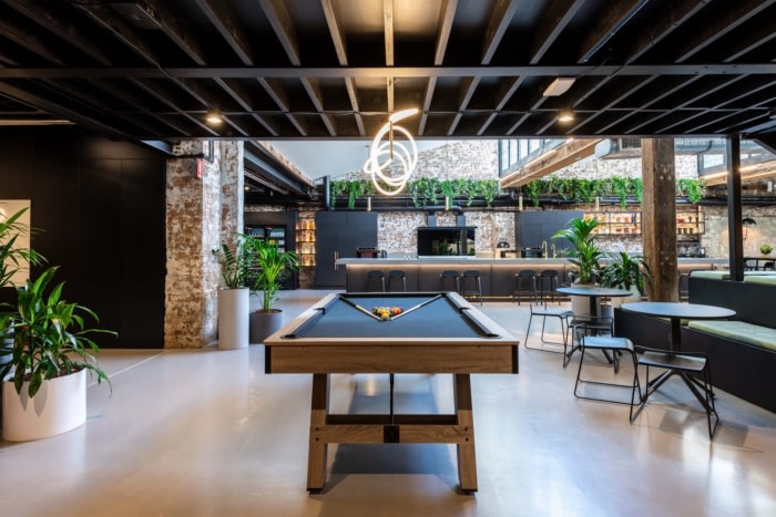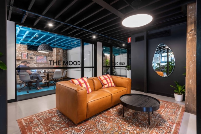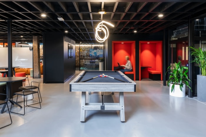 The dark side hosts a suite of digital meeting rooms, touch-down points, work booths, collaboration tables and banquettes. A noteworthy space is the sound recording room and interconnected edit-suite, arming Akcelo with a state-of-the-art facility, inhouse. A signature pool table and tiered seating positioned under stairs connects these two zones.