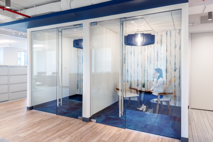 Flipping the prior layout, sshape oriented conference rooms, and shared workspaces around perimeter windows and used ample interior glass to allow natural light to flow into new interior office spaces. Operable walls allow the space to flex to accommodate larger gatherings, while new phone rooms grant privacy when needed. The finished design exceeds ADA compliance standards to accommodate those living with the disease, some of whom are reflected in a custom photographic wallcovering in the break room.