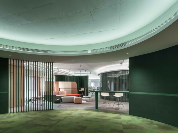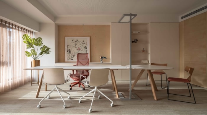 | November 20, 2021HONG Designworks used a consistent and calm color palette throughout the AmberMeeting offices in Xi’an, China.