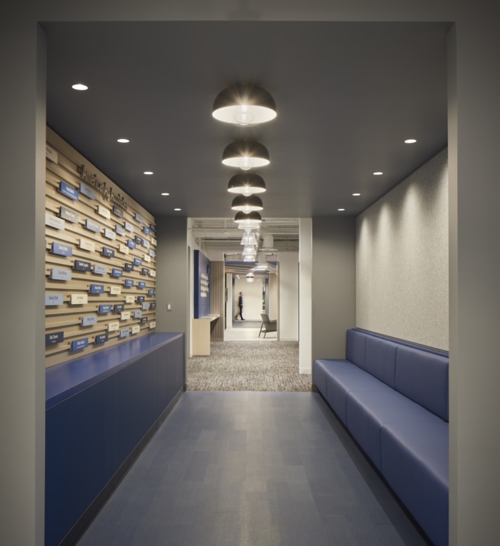 A continuous branding thread begins at the front door and weaves throughout the entire space, tying areas together through the use of logo and graphics, color blocking, a glass timeline feature, and an employee accolades wall with custom-designed millwork.