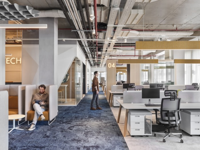 Custom-designed acoustic lighting from “Feltouch Acoustics” was used to provide sound insulation in the open office area. In some areas, ceiling acoustic baffles were preferred.