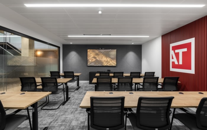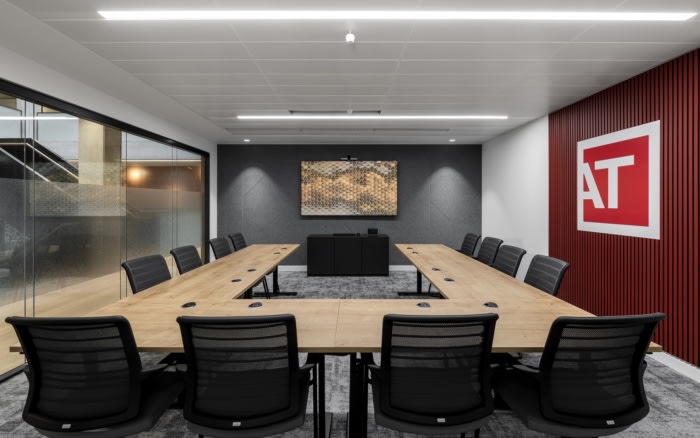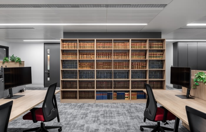 Armstrong Teasdale’s brand identity was quite distinct from the building’s aesthetic. Oktra designed the space to communicate their brand in a way that felt coherent with their existing American offices, yet better suited to the architecture of the building, by incorporating a more tonal, grey colour palette with their red brand colour in the furniture and finishes. This was supplemented with timber vinyl, warm floor finishes and the addition of planting to combine modern features with the more traditional elements of a legal office, resulting in an intimate and refined workspace.