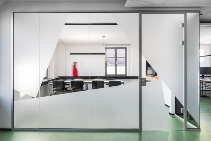 On the first floor there are team and individual offices in the front area. A glass partition creates the separation from the common area, which also includes the representative meeting room. The glass partition walls to the offices were designed with translucent foils in the corporate design and partly allow visual references and partly prevent too much insight.