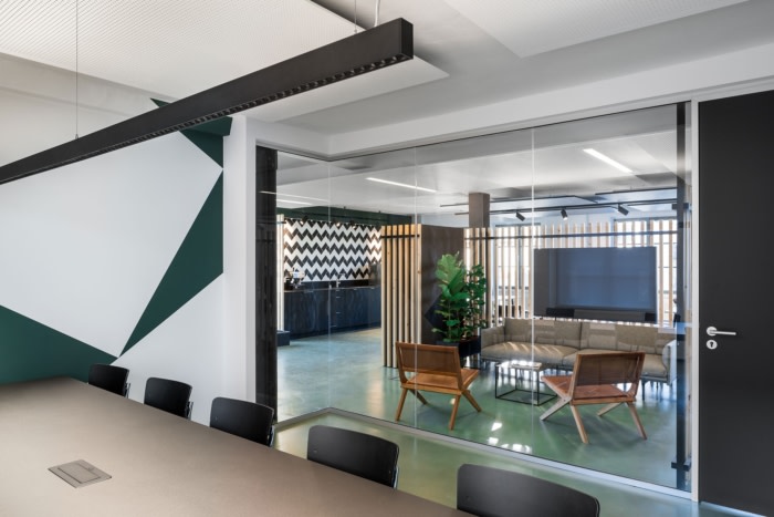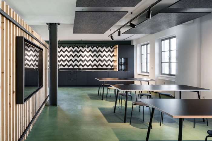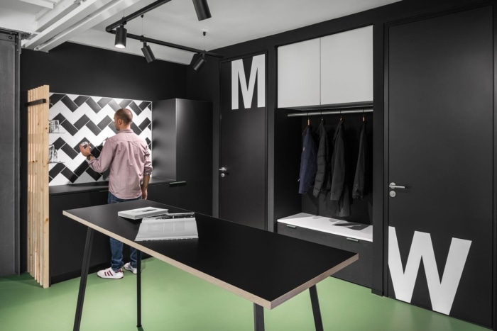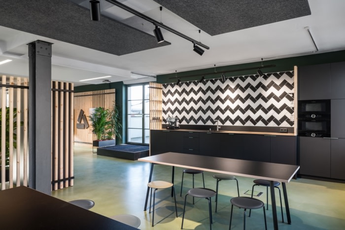 The design dividing element with a logo as an eye-catcher behind the entrance to the communal area serves as a zoning and consists of a slatted construction as an optical divider that still allows light and glances through. The construction leads across the corner and serves not only to accommodate the TV, but also to cover the drinks area with a glass refrigerator and return cabinet. In the lunch area there are 3 large tables with a view of a monitor available to employees. The long kitchen unit also takes up the design with a slatted construction. In this case, these are used to attach boards. The rear wall design with tiles in a black and white contrast is based on the logo of Asphaltgold. The connection between the kitchen and lounge areas is created using a striking wall color. The lounge area with wall design for the presentation of specials is also used for video shootings. In the meeting room, the design can be found with oversized logo elements. In this area contrasted in color in the green tone of the existing facade elements.