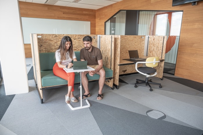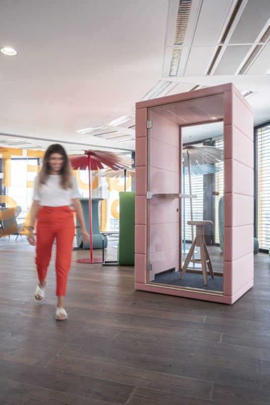 The newly rebuilt 12,800-square-foot workplace in the Enterprise building serves about six hundred employees who have chosen to work in the office and about three hundred who have preferred a hybrid “work from anywhere” model. On six floors, a total of 24 meeting rooms – 14 formal and 10 informal – as well as eight soundproof “microoffices” have been added. There are also 10 silent zones for staff and teams who need to work in quiet environment. Rooms for yoga, massage, and educational activities for children were also created, and an extension of the children’s corner was added to include a place for babies.