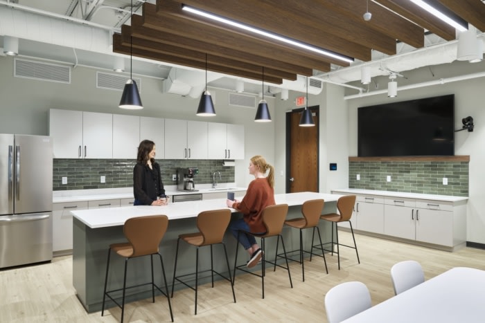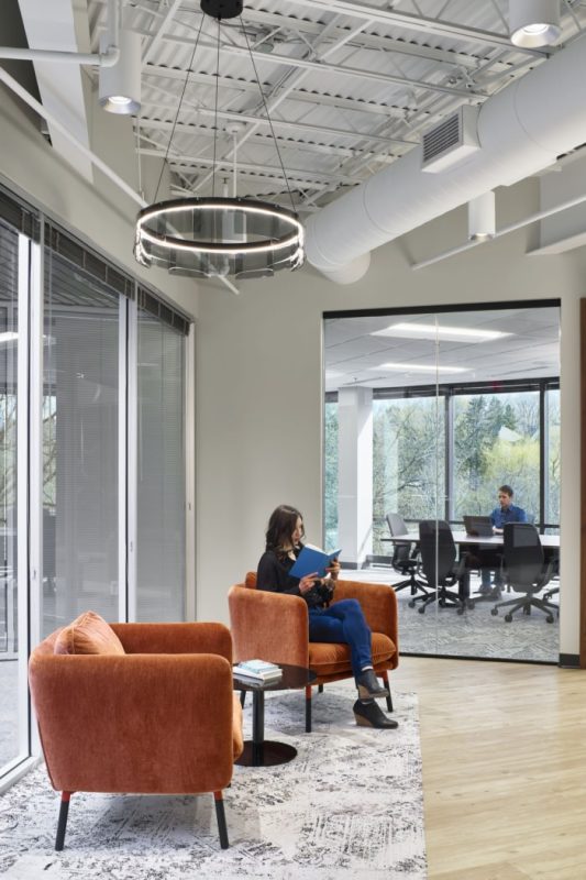 Baker Publishing Group, a Christian book publisher, needed a functional and collaborative office environment that catered to their diverse set of needs while reflecting their brand identity. The 8,400-square-foot office embraces versatility with a thoughtfully curated mix of private offices, open workstations, and a multitude of collaboration areas. Enclosed conference rooms provide a professional setting for client meetings, while high top tables and ancillary furniture groupings foster organic touch points and internal connection. Despite the challenges posed by an angular building footprint and a floor plan divided by a required corridor, the design team strategically positioned the breakroom, amenity areas, and departmental adjacencies to maintain a harmonious flow and uphold the unified company culture.