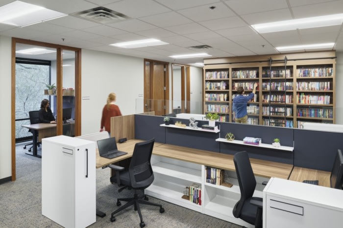 The bookcases in the lobby and open office area are the standout features of this unique space. Brimming from top to bottom with books published by Baker Publishing Group and their publishing partners, they exude a grandiose charm. The bookcases not only entice end users to grab a novel off a shelf and curl up in a cozy chair alongside the fireplace for an engrossing read, but they also celebrate the remarkable achievements and unwavering dedication of the authors and publishing staff.