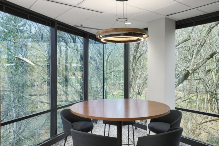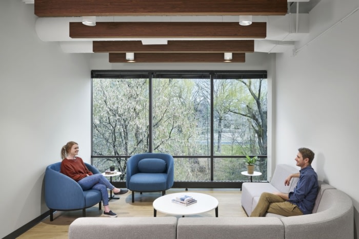 Capitalizing on the picturesque, wooded landscape and marsh land surrounding the building, the conference rooms, break room, and private offices were purposefully positioned along the windows. These strategic placements not only offer breathtaking views of nature but also evoke a sense of tranquility during meetings and lunch breaks and provide a serene environment for editors reviewing manuscripts. The influence of the exterior surroundings extends to the interior aesthetic as well. Soft, earthy tones were carefully integrated into the furniture and finish selections, mirroring the peaceful essence of the flourishing natural landscape just beyond the windows.