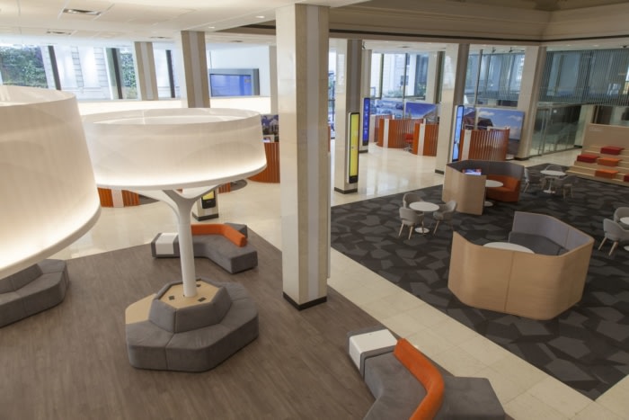 For a more cohesive experience between the physical and digital worlds, this new banking concept incorporates multi-functional spaces such as lounges and community tables for informal meetings, all within an open floor plan.