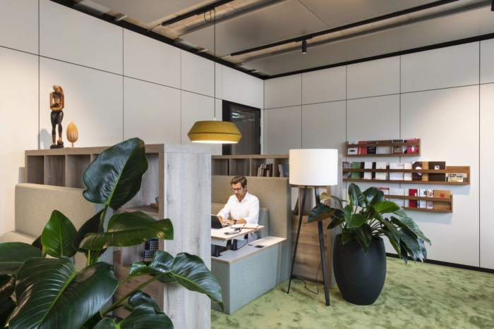 In line with Barry Callebaut’s vision, the workplace concept pays particular attention to sustainability and well-being. Environmentally friendly, certified and upcycled materials have been used along with indoor greenery, in order to create a healthy, productive and pleasant indoor atmosphere. Specifically selected oxygen generating plants in combination with sensors enable monitoring and automatic adjustment of the internal climate according to the data received. Tailored sustainability standards have been developed to achieve project-relevant benchmarks in optimal lighting conditions, indoor air quality, room temperature, noise levels and environmental impact.