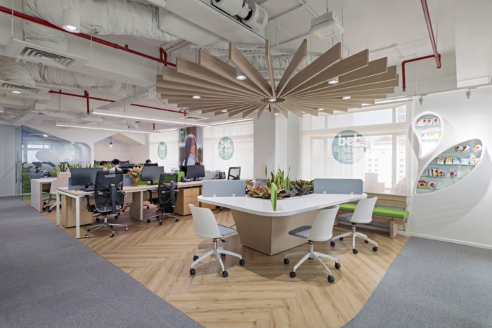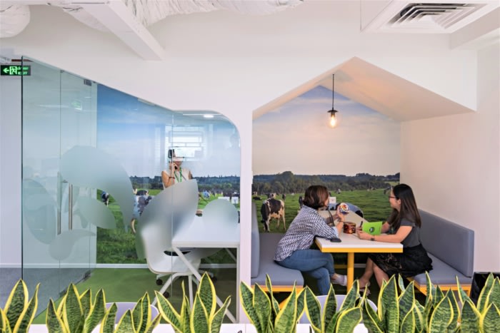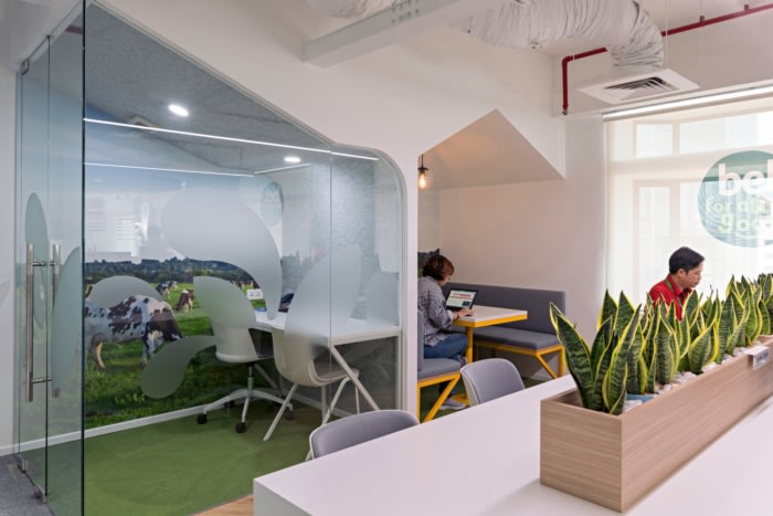 The concept for Bel’s office is ‘Dairy Meadow’ as Space.s team wants to enhance a sense of nature with a fresh and healthy feeling in the office. At the reception, the brand elements are immersed in the space as the green color palette combined with trees and plants to create ‘Dairy Meadow’ experience.