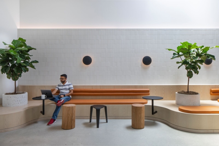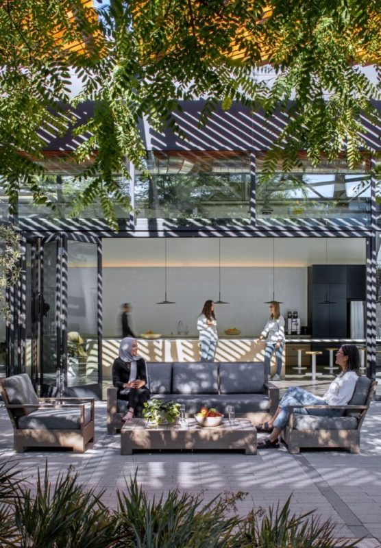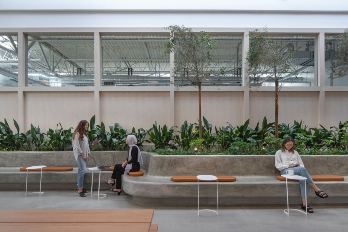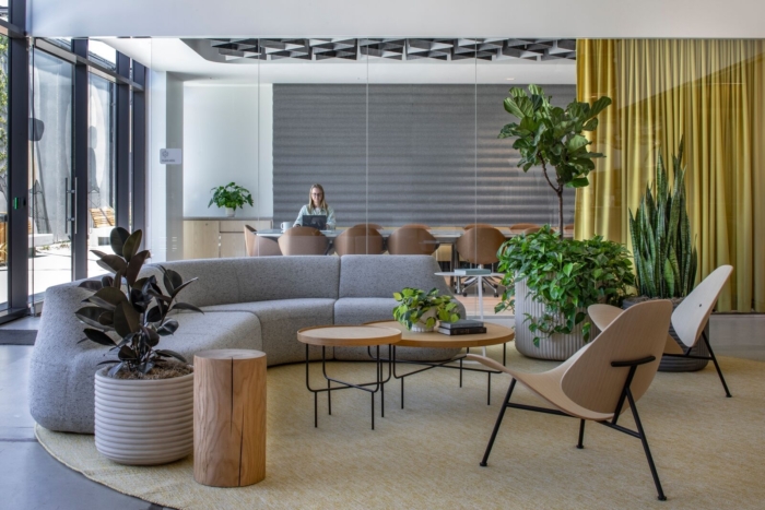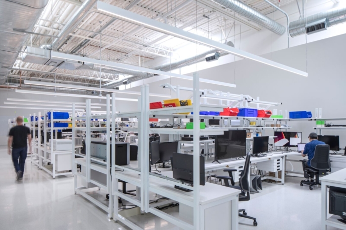 The new office design responds directly to the needs of each Belkin team, resulting in a space that is informed by each step of the product design process. The office is divided into public and private zones. The public zone is filled with natural materials and a warm color palette, and composed of conference, training rooms, event space, and large pantry/seating area that is connected to an existing redesigned courtyard. The private zone consists of flexible workspace, labs, and secure project rooms. This zone is tied together by a wide central skylit street, known as The Circuit, with an open work, landscaped terrace at one end and the “The Grove” at the other; a light-filled collaborative space for all lab workers to connect.
