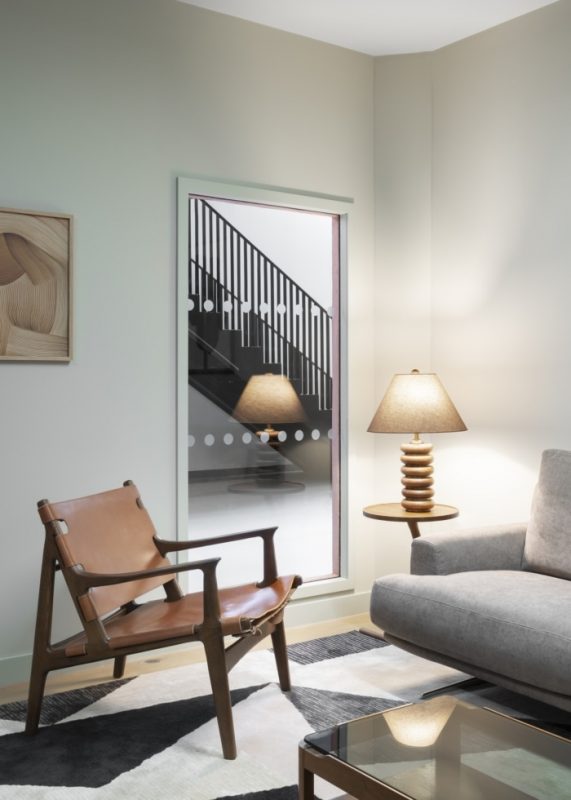 The kitchen inhabiting one of the cavities is cladded in stainless steel to reflect light and act as a distinct centrepiece of the room by the entrance becoming the social core of the office. Handmade glazed ceramic tiles circumnavigate the curved recycled plastic countertop. Carefully curated furniture was selected to activate the space and create a homely and comfortable atmosphere, placed among the cavities and the negative spaces formed between the volumes.