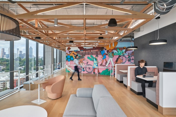 Spanning two floors, the 120,000 square foot space will eventually expand to four floors as BlackRock continues its recruitment in Atlanta. The design concept is driven by three core themes that capture the spirit of the city; the porch, the festival and crossroads.