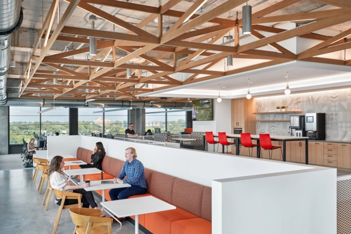 A symbol of where community meets privacy, porches have long been a staple of U.S. southern culture. To emulate this crossover between public and private space, Perkins&Will assigned each end of every floor its own dedicated “porch”, each with its own unique mural and individualized design expressions. Employees are encouraged to take ownership over their porch, utilizing the space as an open yet intimate environment to which they can invite employees from other floors, as well as host clients and guests.