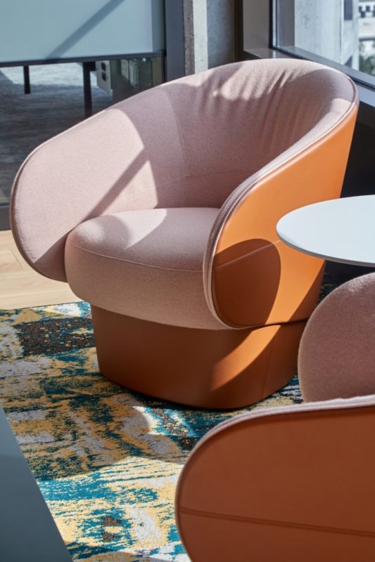 Finally, the design theme of “festival” is captured through the introduction of spaces that encourage impromptu congregation and collaboration. Echoing Atlanta’s vibrant culture and history of large-scale festivals, the workplace’s design attributes, from the flexible spatial planning to the furniture and lighting choices, were all conceptualized to inspire employees to connect over creative work.