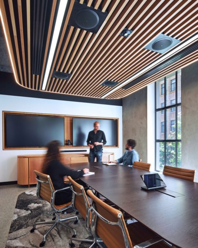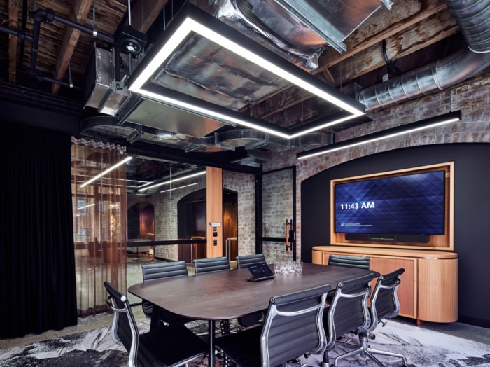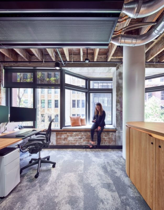 Three levels of open plan work areas and strategically located meeting rooms enable team collaboration and flexibility with full height glazing creating a modern, almost transparent insertion. Close collaboration with the architects fjmtstudio holistically balanced the buildings’ heritage brick walls, timber ceiling soffits and exposed services.