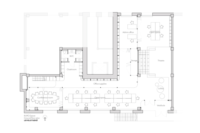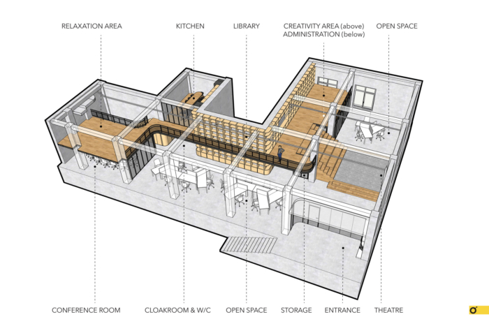 By introducing a mezzanine level, we managed to increase the usable floor area and add auxiliary spaces to the program, exceeding the brief requirements. The program includes various working, gathering and relaxation spaces, as well as a central theatre stage for talks and performances.