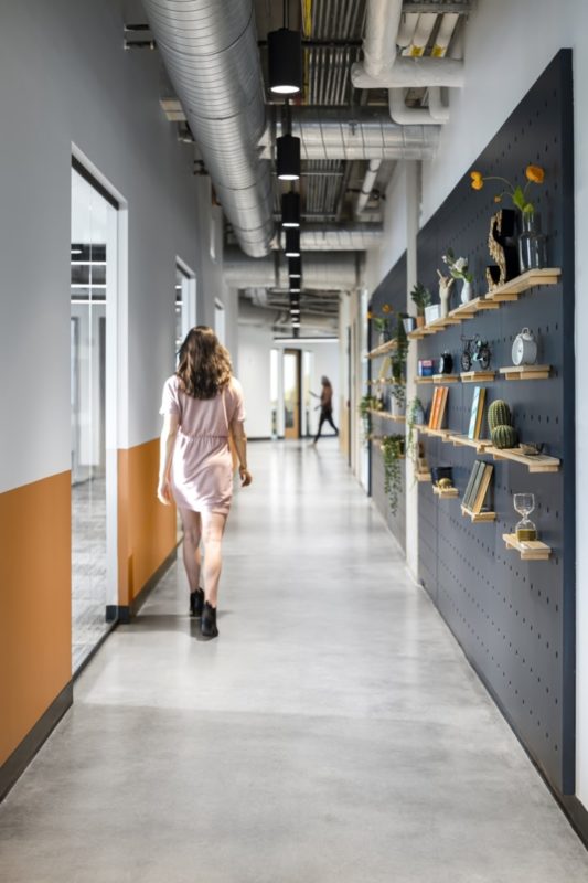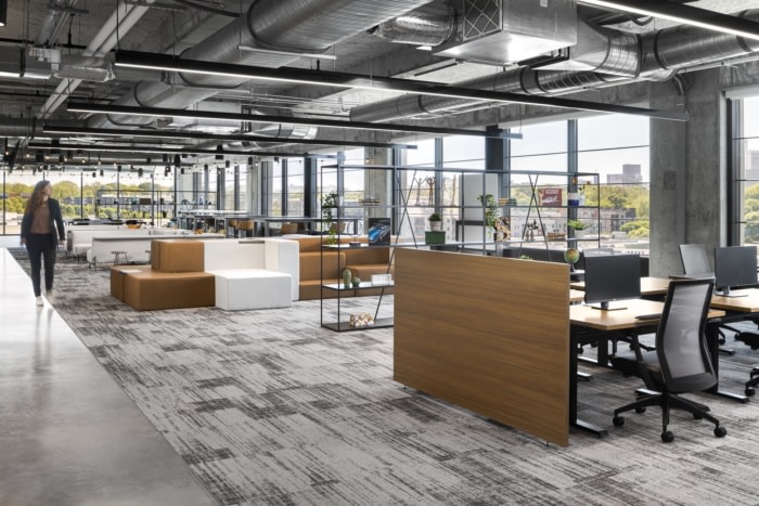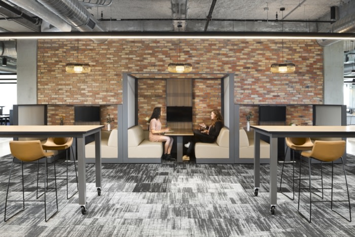 With Unispace’s integrated approach, use of smart technology, and global capacity, they were able to collaborate with the firm’s internal team to create a creative and unique design concept that blended their aesthetic and typicals in line with their standards. Paying homage to the city, the office has industrial and modern features, with concrete floors, black metal accents, and pendant light fixtures. Customized tiled backsplashes, a unique paint scheme, and string party lights thoughtfully integrate the local environment with the office interior. A variation of space types supports their agile work style and client needs from phone booths, to workstations, to conference rooms and collaboration and socializing hubs.