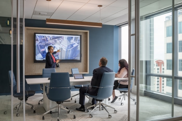 Collaboration spaces were designed to support a variety of work styles and team settings to encourage and facilitate interaction among staff and have fully integrated and seamless access to audio visual components. The space suggests quality and longevity, while maintaining an aesthetic that reflects the technological innovation of the future.