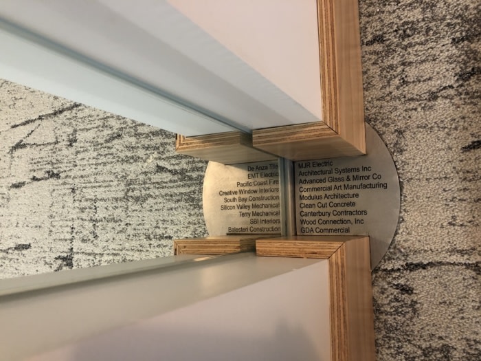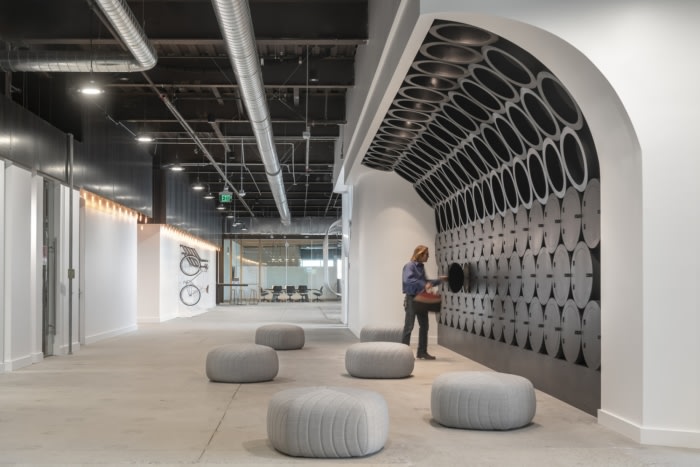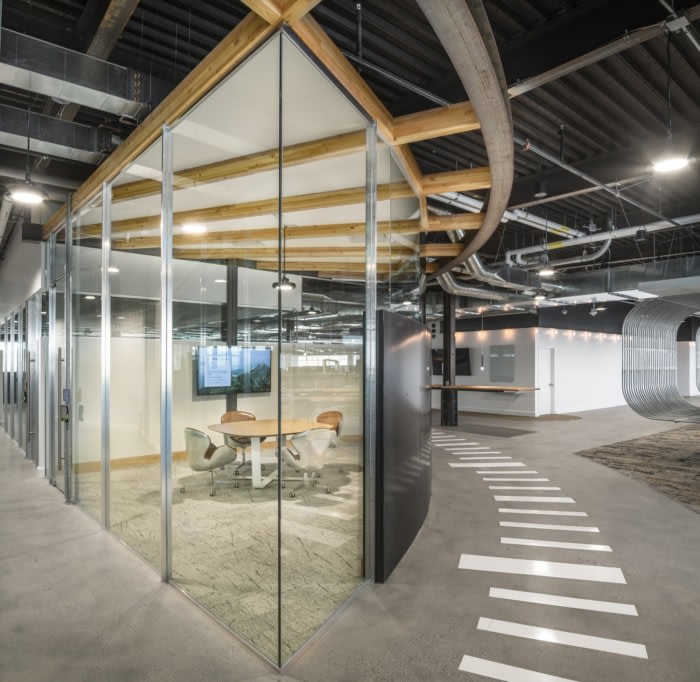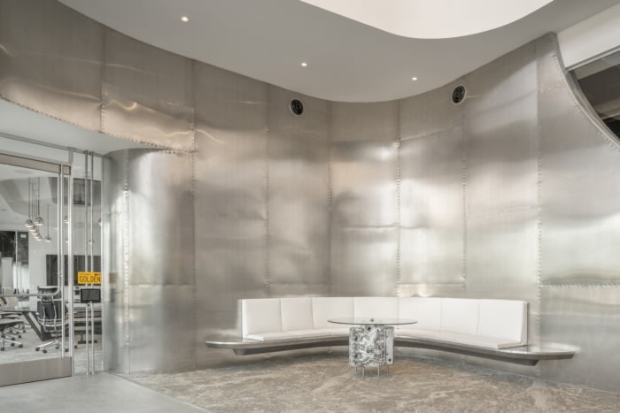 All occupants enter through an aluminum panel clad lobby, reminiscent of early aviation and airstream designs, and are met with a series of touch enabled devices displaying the building floor plans. This interface, below discs which reflect the company’s wide array of data expertise, prompts the user to pick a space for the day, find a team member, locate the proper meeting room, or receive important company messaging. Similar to finding the red or green light in a modern parking garage -location, flexibility, and opportunity are intertwined in a space layered with material honesty and a heap of tech under the hood.