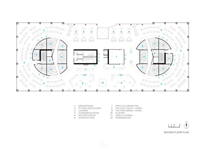 The equal importance of all employees is quickly evidenced by the segmented and radiating workstation groups. Oriented to allow the ringed windows to pour daylight into the space, small gatherings that don’t necessitate a room take place at the outer ring of the hubs. As more privacy is desired, groups move inward to find mixed conference rooms comprised of varying levels of full height and clerestory glass & steel walls which are all interconnected yet meet individual needs. A fluid and seamless evolution of acoustical and visual privacy where each piece and part ties into the successful operation of the whole.