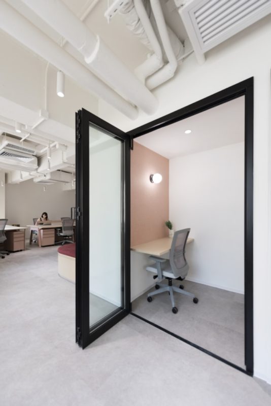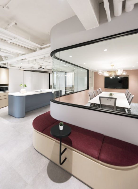 The space is located in the vibrant district of Wanchai Hong Kong, in an office tower with panoramic windows to the streets. The wedge-shaped floor plan offers a flexible internal layout, with only one column in the open-plan space – a feature that was preserved in the design.