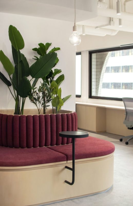 The red element, constructed in timber and red cushioned fabric, is an architectural strategy to organise and connect the different functions of the workplace. It starts in the welcoming reception space as a fabric seating bench, which continues into the general open-plan workspace. It then turns and wrap around a feature column to form a planter element for the working neighbourhood, and along the main walls to provide ample seating opportunities for employees to chit-chat, personal working or relax. Small circular tables are built into this red seating element, with pendant lights to support reading or informal meeting activities.
