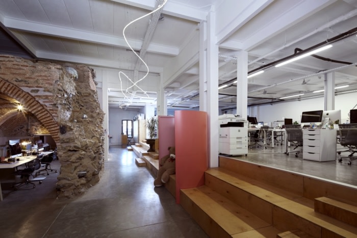 This building was built on historical ruins which were presumed as Ottoman Hammam. This new building was constructed in steel structure considering the remains. The former tennant covered the historic walls with gypsum drywalls. We wanted to combine the heritage with the new building so we uninstalled the drywalls. The old ruins were cleaned with restoration specialists in two weeks.