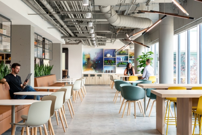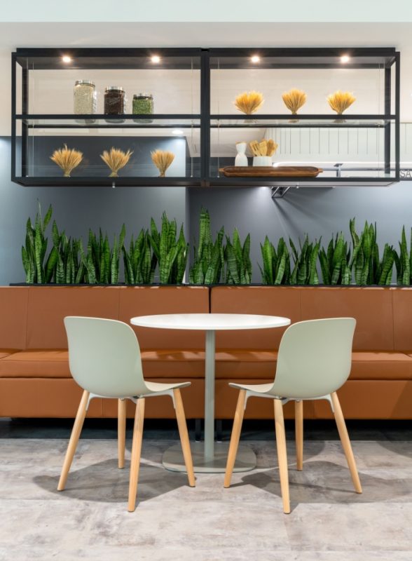 The team incorporated sustainability and wellness best practices into the design. New LED lighting, HVAC upgrades and water stations align with WELL design principles. Desks with sit-stand capabilities surround the perimeter of the building to ensure access to natural light. Biophilic elements, such as natural wood, green walls and plants, create a visually harmonious space and improve indoor air quality.
