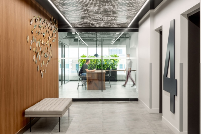 Rich wood walls and a ceramic art installation in the elevator lobbies mimic moss growing on a tree trunk. A sculptural, undulating wood wall constructed by a Canadian woodworker flanks the reception and conference areas. Warm woods and tones, local stone and a suspended fireplace give the workplace a hospitable feel.