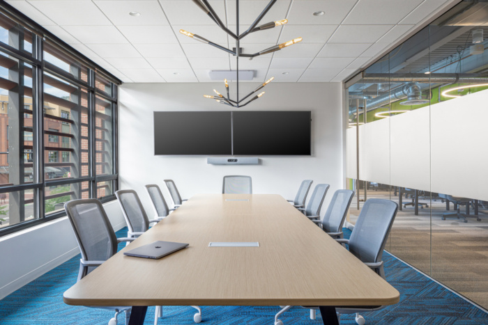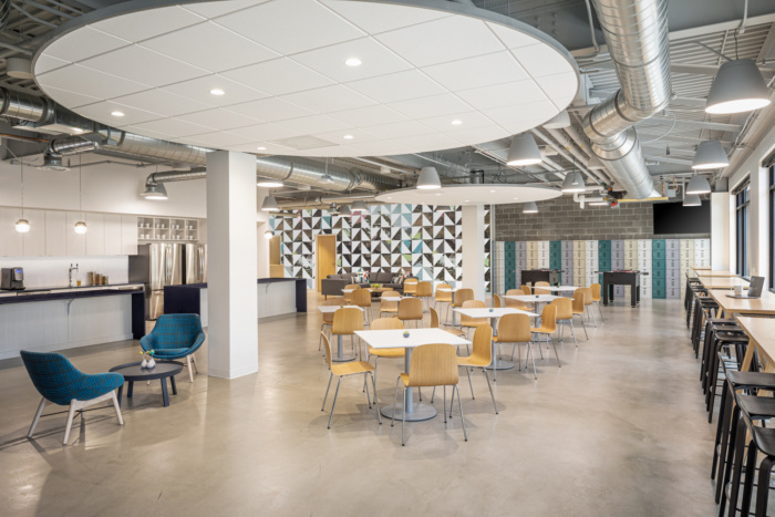 The project included an open workstation area, meeting rooms, a game area, lockers, bike storage, touch-down huddle rooms, and collaboration spaces. The build-out also consisted of a divisible training room, phone rooms, and large break area/entertaining space.