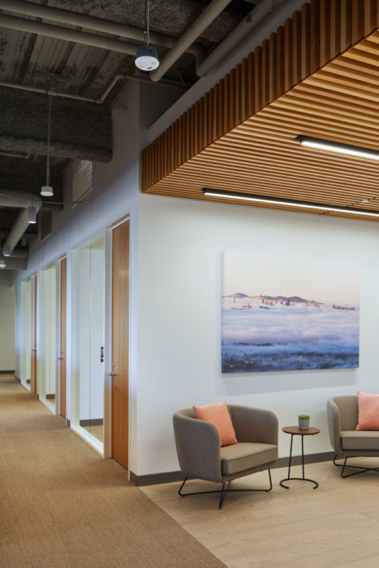 College Futures Foundation engaged TEF to design its new offices to both reflect the organization’s innovative approach to philanthropy and embody their decades of service to the students of California. The broad, open work area was carefully configured to maximize access to daylight and sweeping views of the East Bay hills. Warm, inviting materials that evoke nearby landscapes give the space its character. Perimeter meeting and office spaces, supporting a range of private and collaborative work, embody themes drawn from California’s natural environment. The spaces are anchored by a 1,200 square-foot communal gathering hub, bracketed by an open kitchen and the wide curve of exterior windows, that supports the Foundation’s culture of engagement and equity
