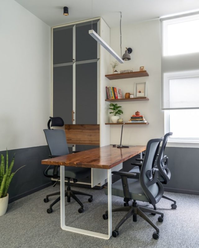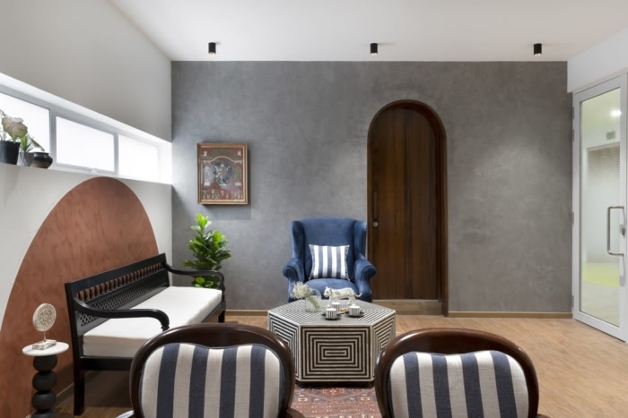 A vertical garden wall, with company name, welcomes the visitors upon entry. The workspace takes advantage of the natural ceiling height to attain an open, spacious feel and receives ample day light. The eastern glass façade is fitted with a second layer of UV glass and an air gap in between to provide insulation thereby reducing the AC load and power consumption. The western wall is opened up at the top to bring in indirect natural lighting. Focus on sustainability is applied from macro to micro scale, with elements like table-tops made of reclaimed wood and accent lights, pin-up boards & workstation pinups furnished with left-over fabric from the company itself. The latter of which elucidates a deeper connection between the staff and the company making the project, in its entirety, more personal and closer to heart.The collaborative spaces made with perforated steel matching that of the main entrance maintains visual connectivity without breaking the openness of the space. The polished grunge-pattern cement flooring and raw wood grain texture on the furniture contrasts against the elements of vibrant green used throughout the design, subconsciously triggering a sense of excitement. The abundance of green elements and greenery spread throughout the space blends with the natural landscape outside, integrating it – an embodiment of the concept of embracing new exciting ideas while the shades of blue in the space represents commitment and bond between the staff and the company.