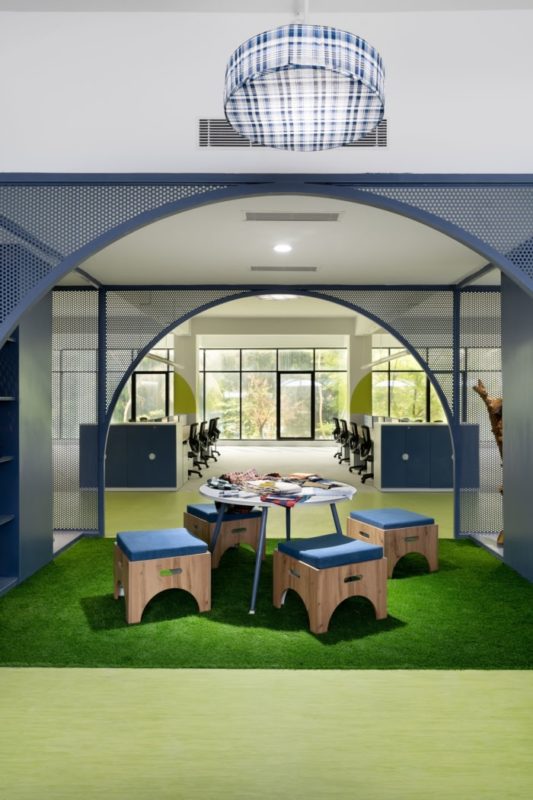 The vendor meeting rooms at the entrance are airy, open spaces with light furniture & uninterrupted views to the garden below. The entrance is marked by a bold perforated metal archway donned in the company’s home blue colour creating a brand statement that inspires and welcomes its customers and employees.
