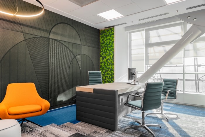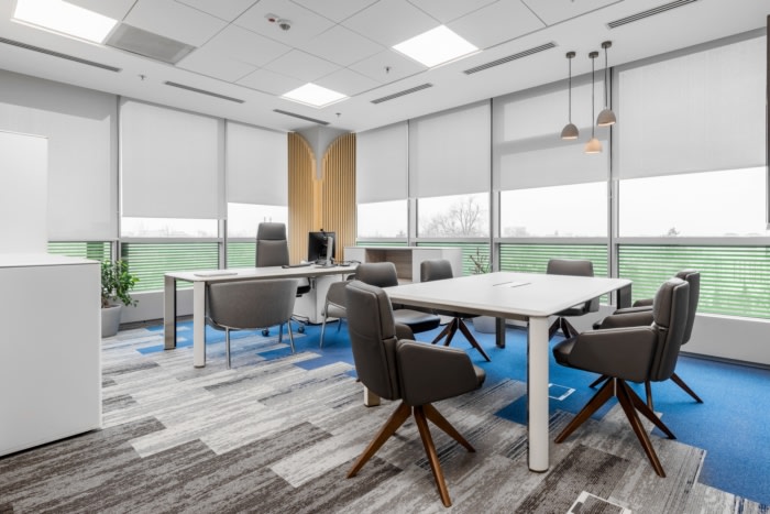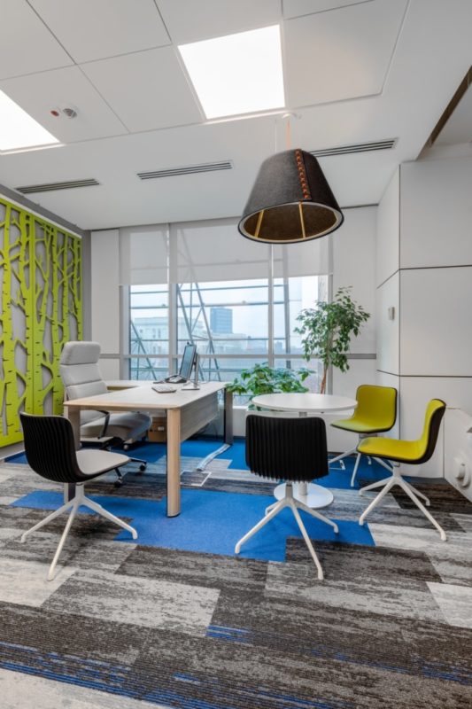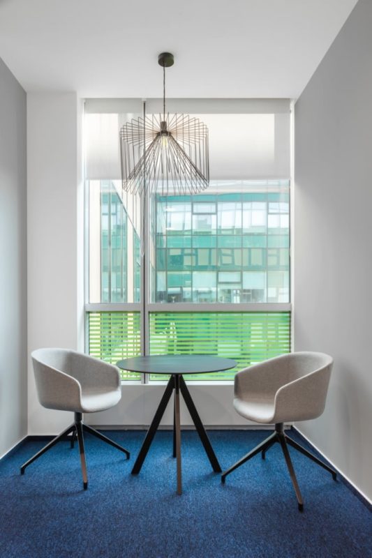 The specifics of the business division had to allow accommodating future expansion and to promote synergy amongst the colleagues. The client had also another special request regarding the individual head of divisions offices that needed to perform multiple tasks as: private meetings with the team, space for individual quiet working hours, frame for meetings with visitors in which presentations would be given and also relaxing breaks during the day which had to allow recharging the batteries.