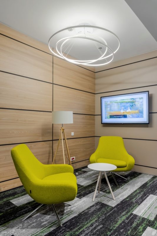Natural oak and white furniture together with daylight lamps were used to achieve an open atmosphere. Surface decorated with moss successfully fit into the reception area emphasizing graphic symbols from the brand identity.